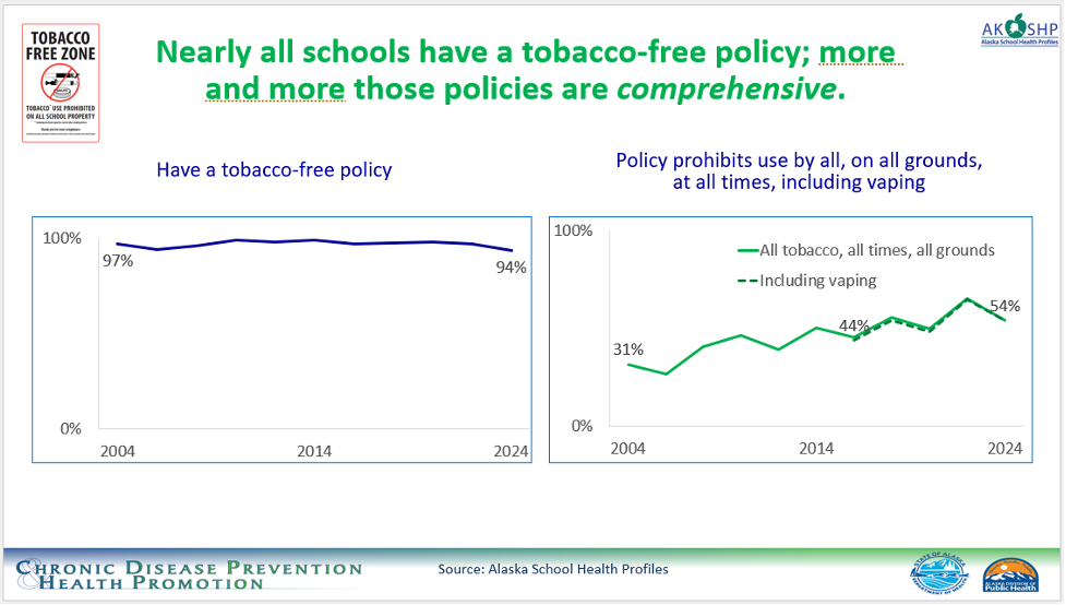 In the 2024 Profiles survey we learned that while 94% of Alaska’s secondary schools have a tobacco free policy, only 54% have a comprehensive tobacco-free policy, one that prohibits use by everyone, on all school grounds, at all times, and includes vaping. The 2023 YRBS reports that 22.9% of high school students statewide use some form of tobacco, with e-cigarettes as the most commonly used product at 17.3%. This is concerning given their high concentrations of nicotine and their harm effects on youth.