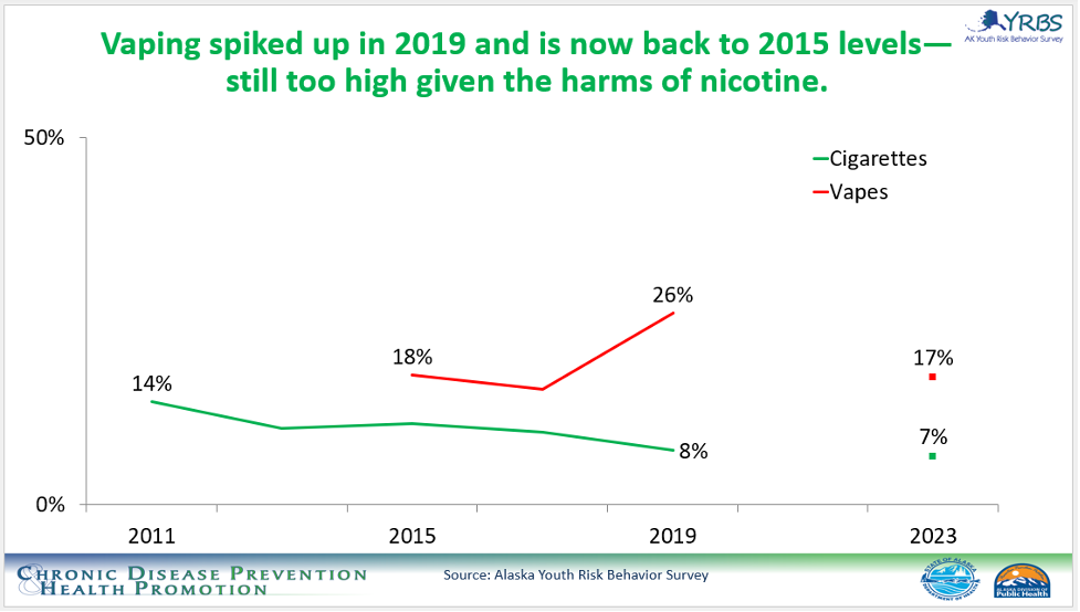 Alaska’s schools can receive free resources to help address youth tobacco and nicotine use. Almost 1 in 4 (23%) used a tobacco product according to the 2023 Alaska Youth Risk Behavior Survey data. This includes all types of tobacco products, like e-cigarettes, cigarettes, and nicotine pouches.