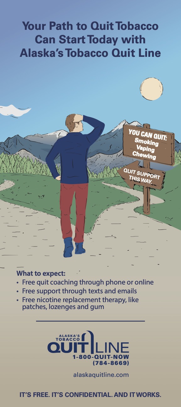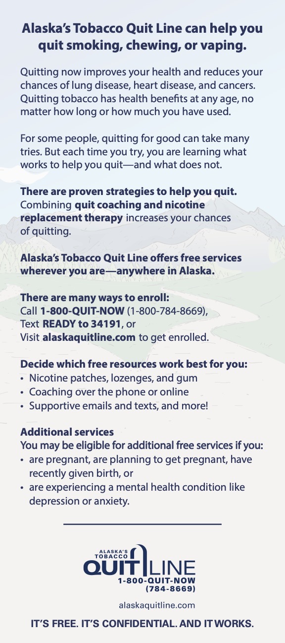 You are invited to help promote the American Cancer Society’s Great American Smokeout on November 20, 2025. This national event on Thursday, November 20 encourages people who use tobacco to quit for the day. You don’t have to go it alone. Alaska’s Tobacco Quit Line offers free, confidential coaching and nicotine replacement therapy and is available 24/7!