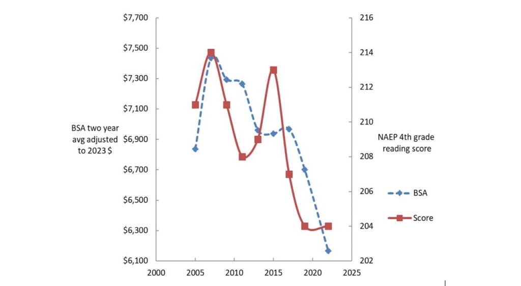 The chart below from Bronson’s study shows a clear parallel between declining inflation-adjusted funding and lower test scores over the past two decades.  In 2007, inflation-adjusted per-pupil funding was $7,450, and NEAP test scores were 214; by 2023, funding had dropped to $6,150, a 21% decline, and test scores fell to 204, a 5% decline. †