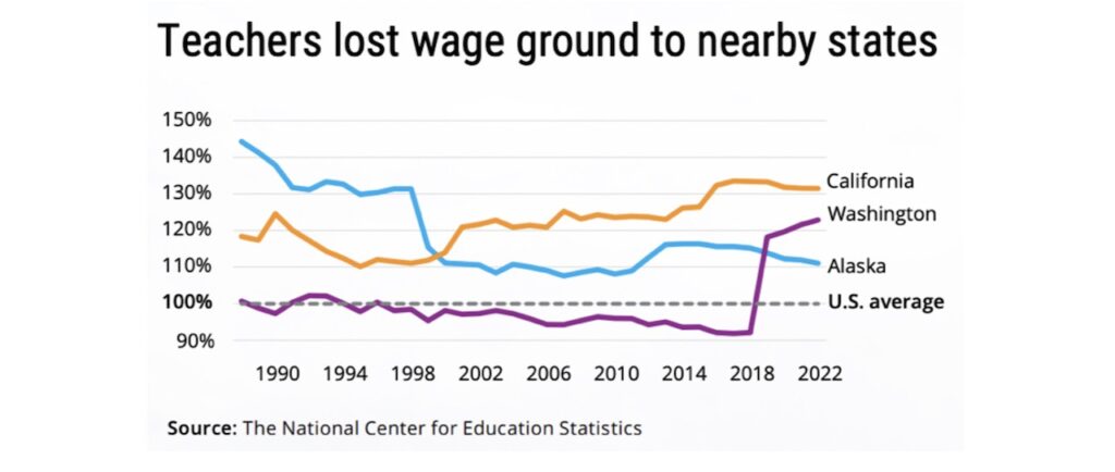 • In the 1980s and ‘90s, Alaska had a distinct competitive advantage; it had the highest average salary for teachers at 170% above the national average. In 2022, Alaska ranked 10th in the nation, just 111% above the average. Meanwhile, neighboring states have significantly increased their pay. 6