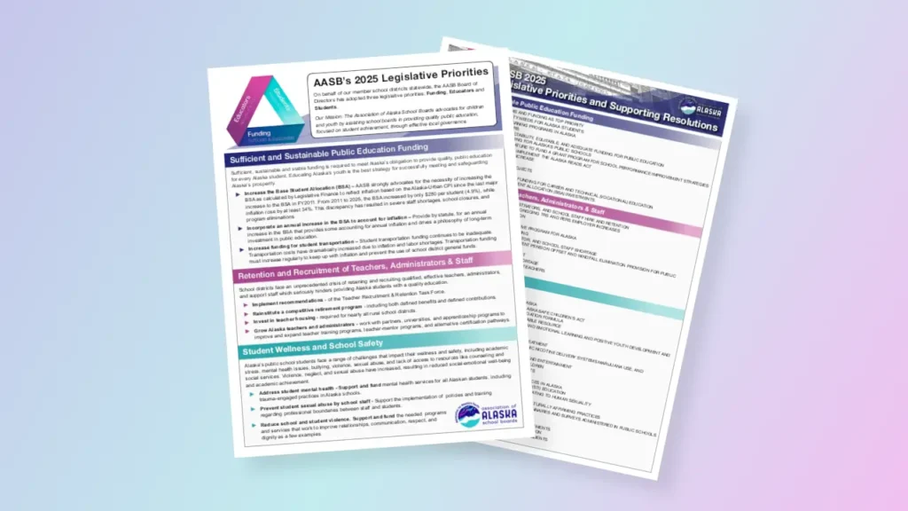 The AASB Board of Directors has reaffirmed three top legislative priorities for this session, reflecting the most urgent challenges facing Alaska’s schools and communities: